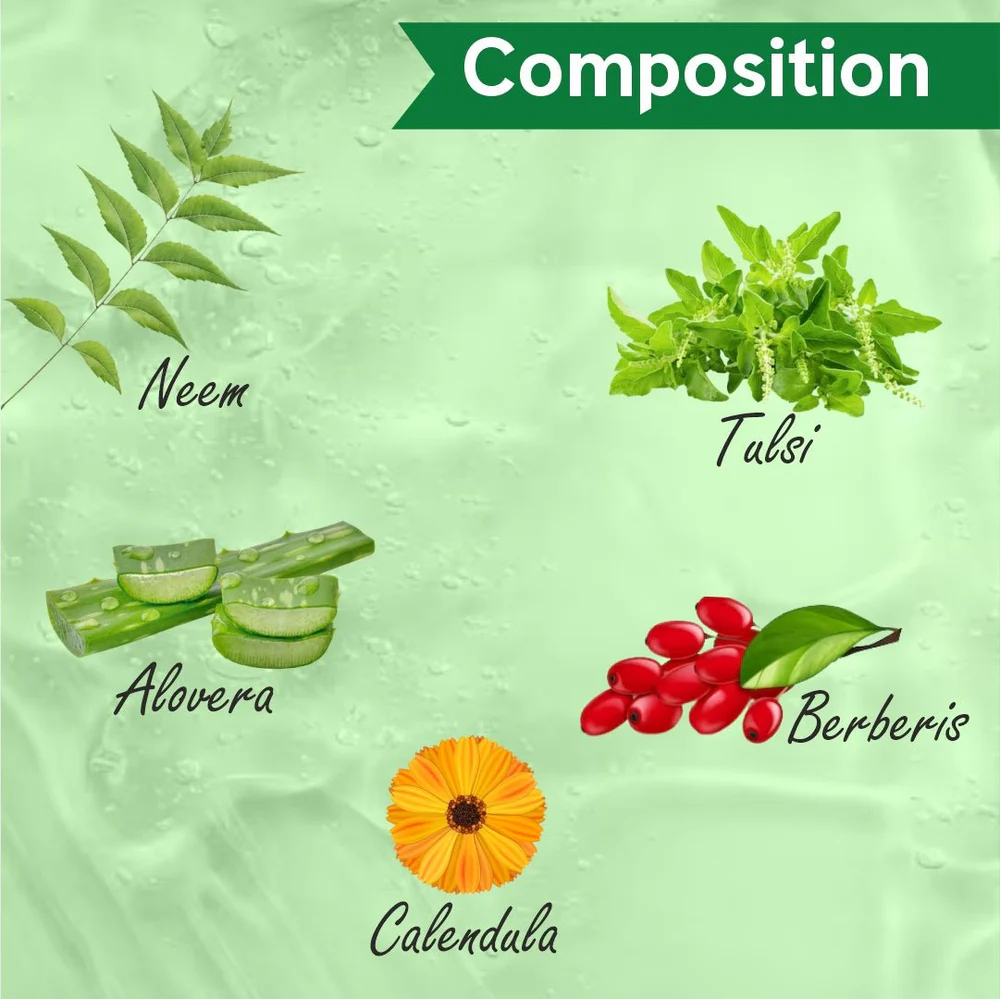 A herbal soap enriched with Neem, Tulsi, Aloe Vera, and Calendula, designed to cleanse, hydrate, and protect the skin, making it ideal for daily use and suitable for all skin types.