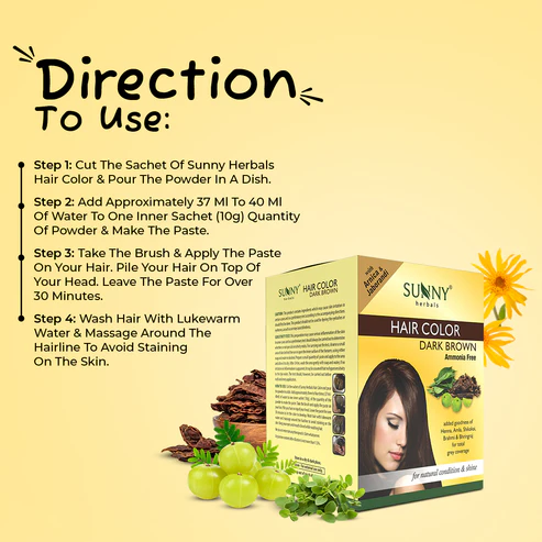 Sunny Herbals hair color is an ammonia free natural hair color that dyes hair from the roots for a bright color and shine. Sunny Herbals Hair Color Ingredients include the goodness of henna, amla, shikakai and bhringraj.
