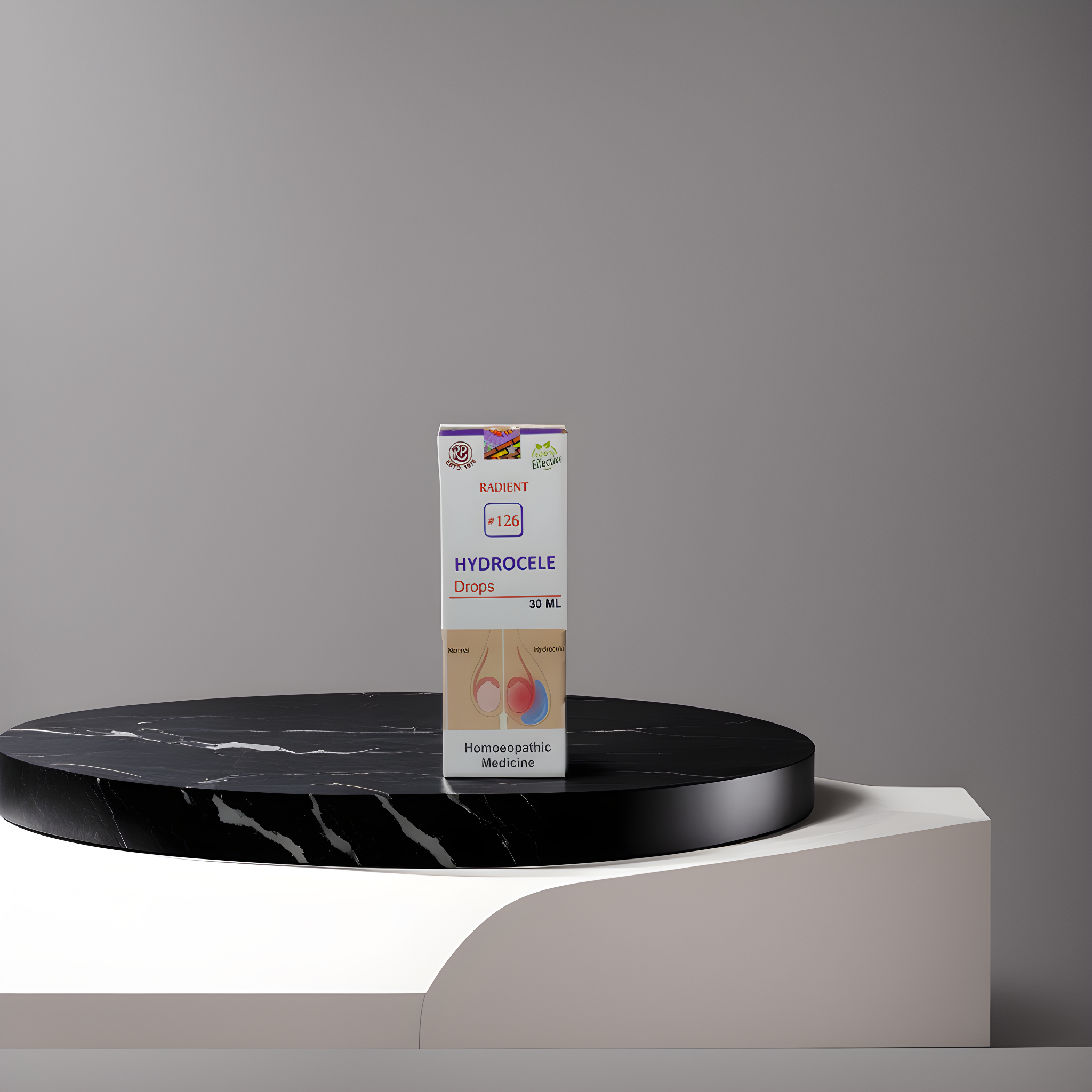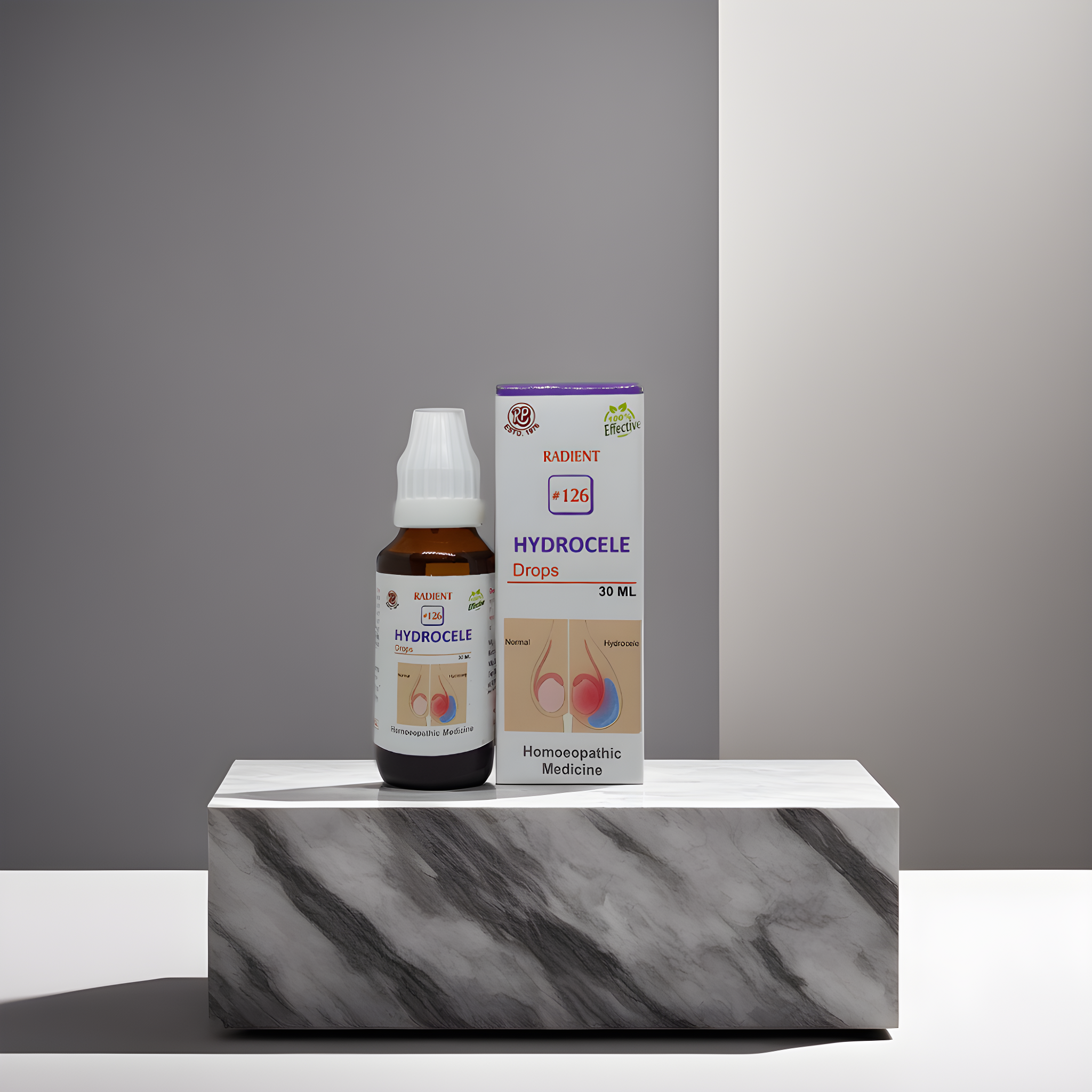 RADIENT 126 HYDROCELE DROPS is a homeopathic treatment for Hydrocele – a painless build up of watery liquid formed around either side of the testicles that causes scrotum or the groin area to swell. They are not necessarily harmful or painful and is normally caused due to inflammation or infection of the testicles.