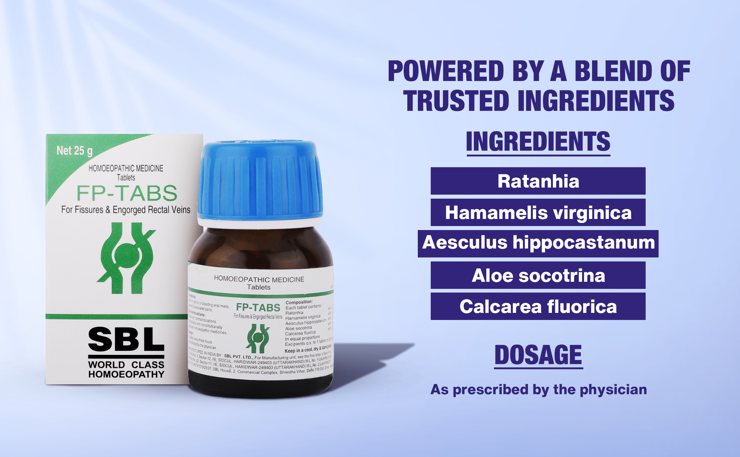 SBL's FP-Tabs are taken orally and are an ideal combination to treat engorged rectal veins and fissures. It has no known contra-indication.
