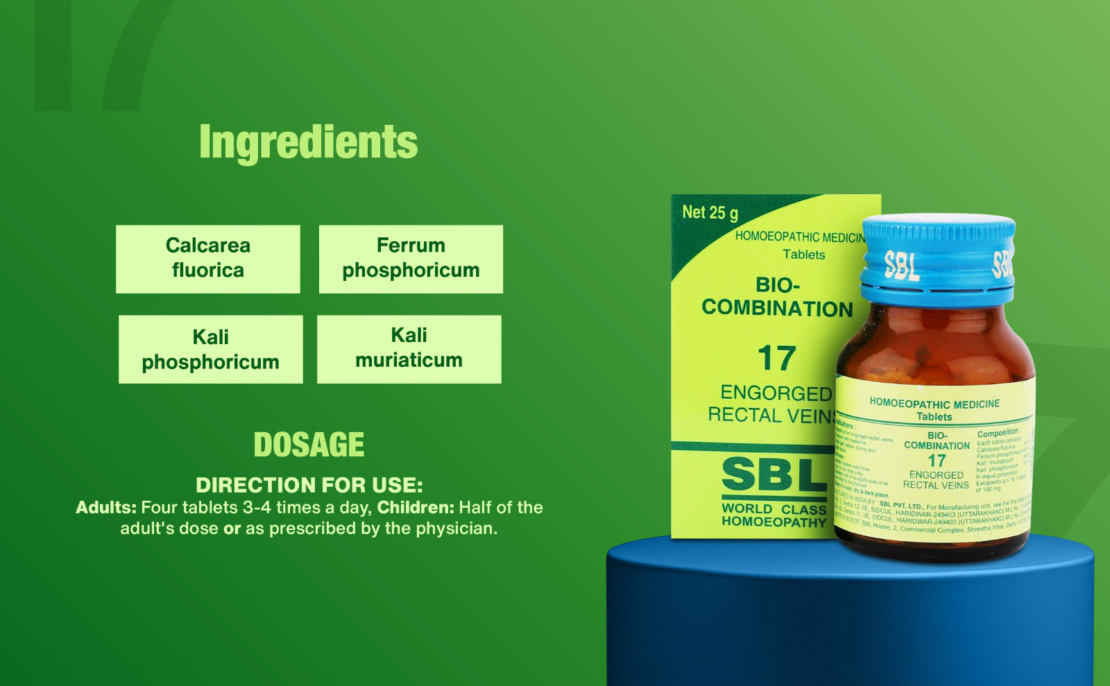 SBL Bio-Combination 17 is a specialized medicine assist to help relieve constipation and assist in reducing the size of pile masses, thereby helps easing associated pain, bleeding, and discomfort.
