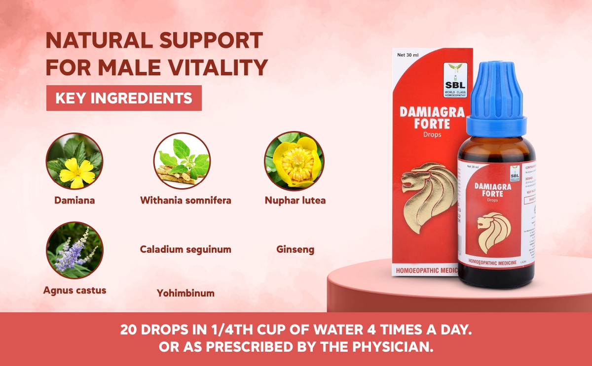 SBLāS Damiagra Drops is composed of well-balanced homoeopathic medicines that help patients regain their lost confidence. It helps in improving sexual stamina, vitality, sexual weakness and in cases of Erectile Dysfunction (ED). By addressing the root causes, such as poor circulation, hormonal imbalances, and emotional stress, this formulation support better blood flow to the genital area, aid in energy levels, and sexual confidence. This work holistically to balance the body's systems, helps improving both physical and psychological aspects of sexual health. It is also regarded as the best homeopathic male vigor and stamina medicine for overall improvement in sexual well-being.