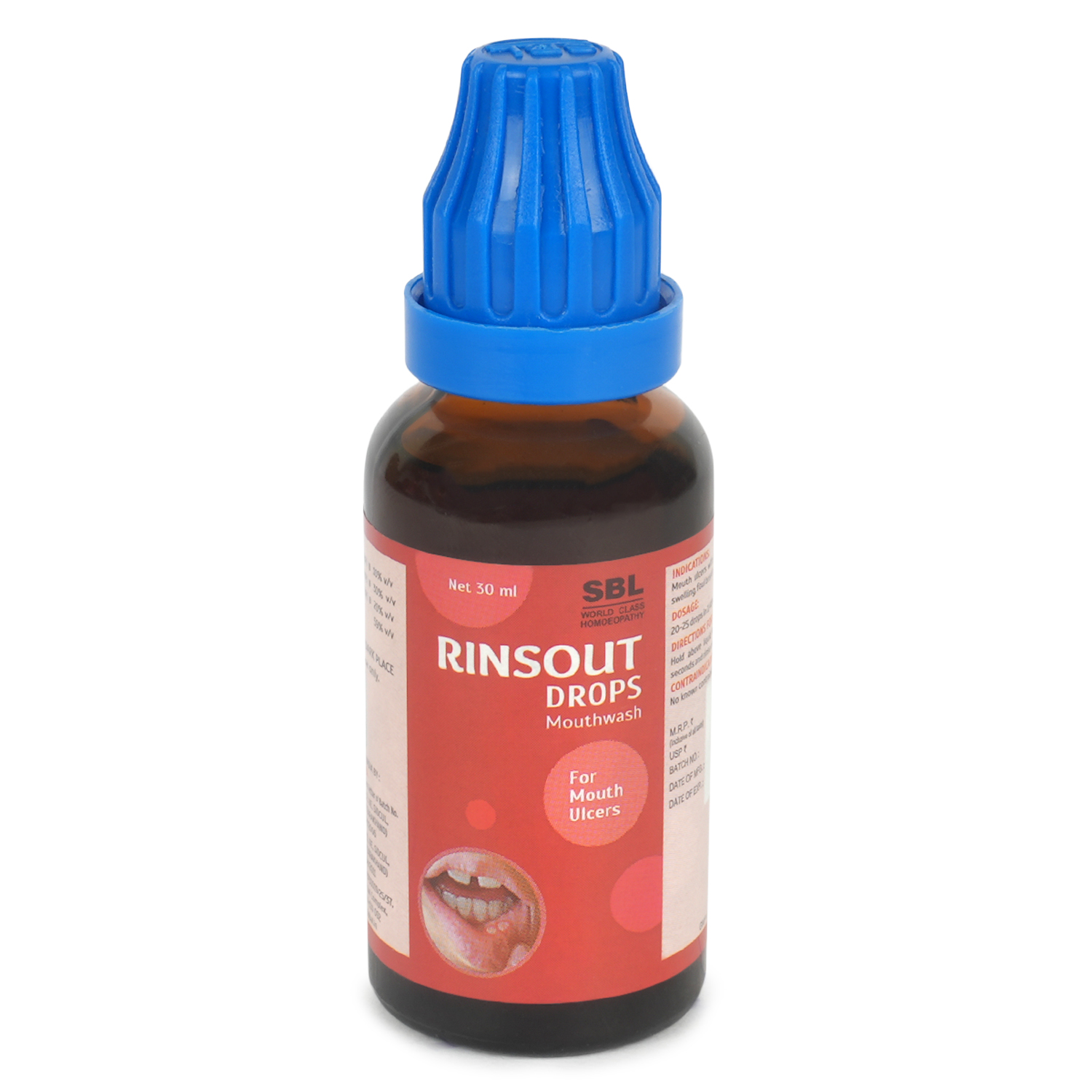 SBL Rinsout Drops Mouthwash helps in relieving painful mouth ulcers and gum discomfort. Mouth ulcers, medically known as aphthous stomatitis, are small, shallow sores that can appear on the cheeks, gums, tongue, lips, or the roof and floor of the mouth. These ulcers often cause significant pain, making eating, drinking, and talking uncomfortable. They may develop due to predisposing factors such as deficiencies of iron, folic acid, or vitamin B12.