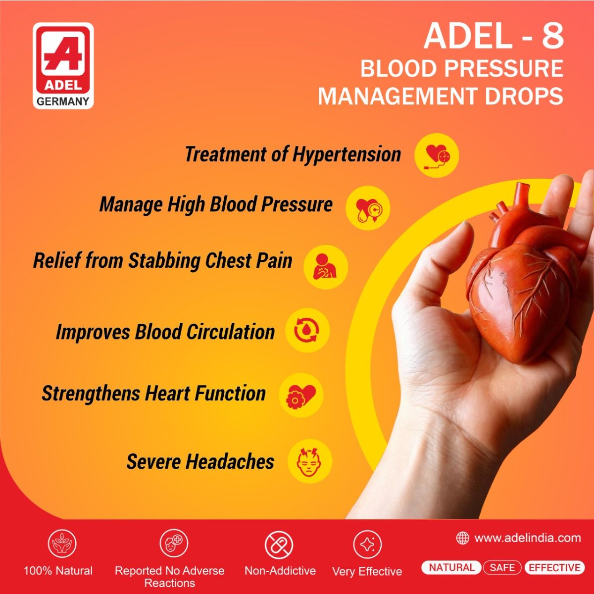 ADEL 8 (co-HYPERT) drops helps reduce and control high blood pressure particularly in cases where no easily recognizable cause can be diagnosed. This remedy also helps relieve hypertension related to elasticity problems, psychosomatic processes and organ (renal) insuffciency and can help prevent conditions that may lead to an infarct.